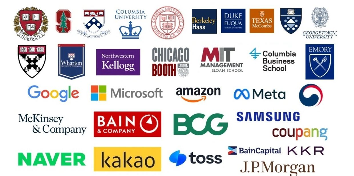 총 180명 이상의 클라이언트들이 상위 MBA 및 대학, 빅테크, 사모펀드(PE), 벤처캐피탈(VC), 데카콘, 유니콘, Tier 1 PE/VC 지원자들이